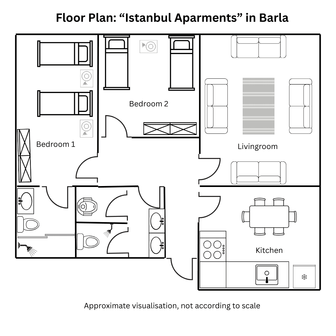 • In Barla: “Istanbul Apartments” by Istanbul Foundation for Science and Culture – 2 bedrooms with 2 single beds in each room, 2 bathrooms, large living room, and a fully equipped modern kitchen.